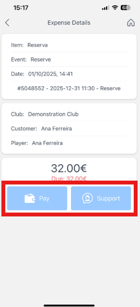 3.3 Click Support to open a direct communication channel with the club or organization.